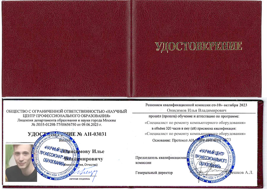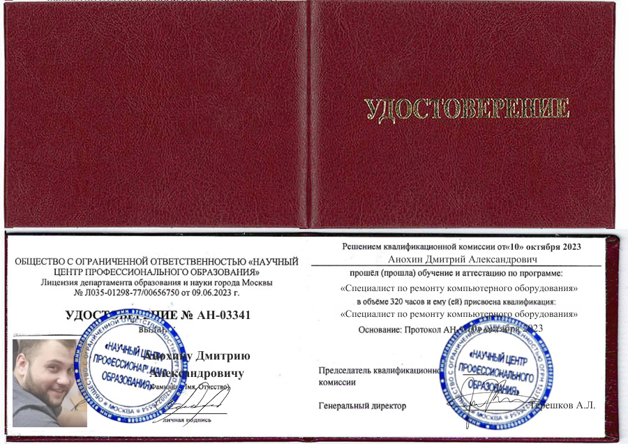Квалификация: «Специалист по ремонту компьютерного оборудования»