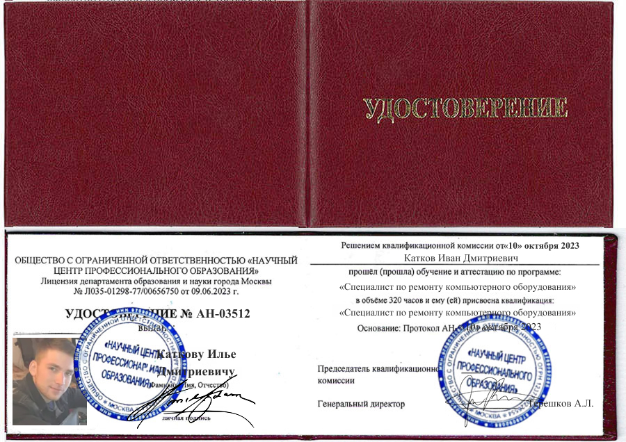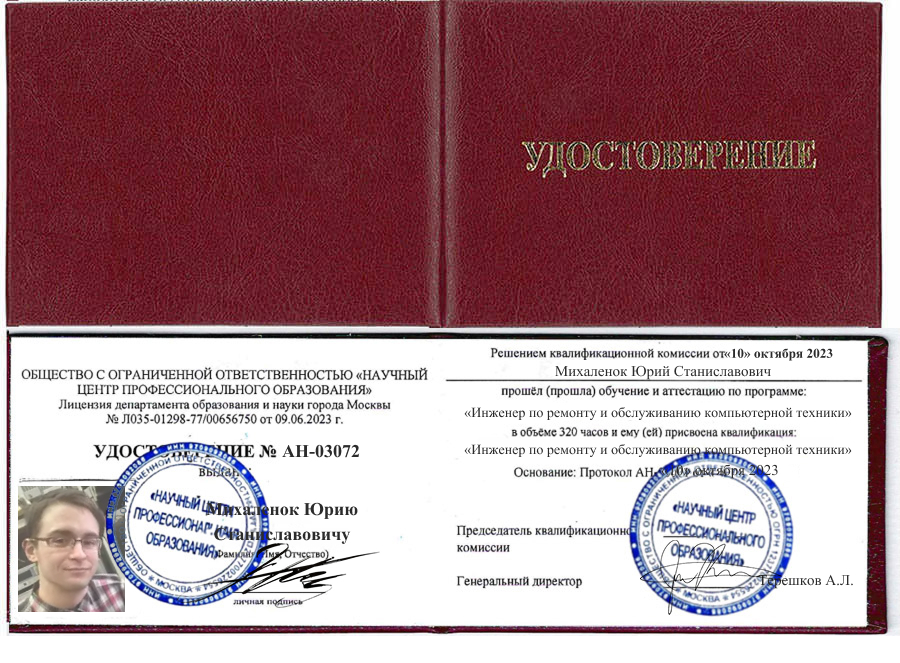 Квалификация: «Инженер по ремонту и обслуживанию компьютерной техники»